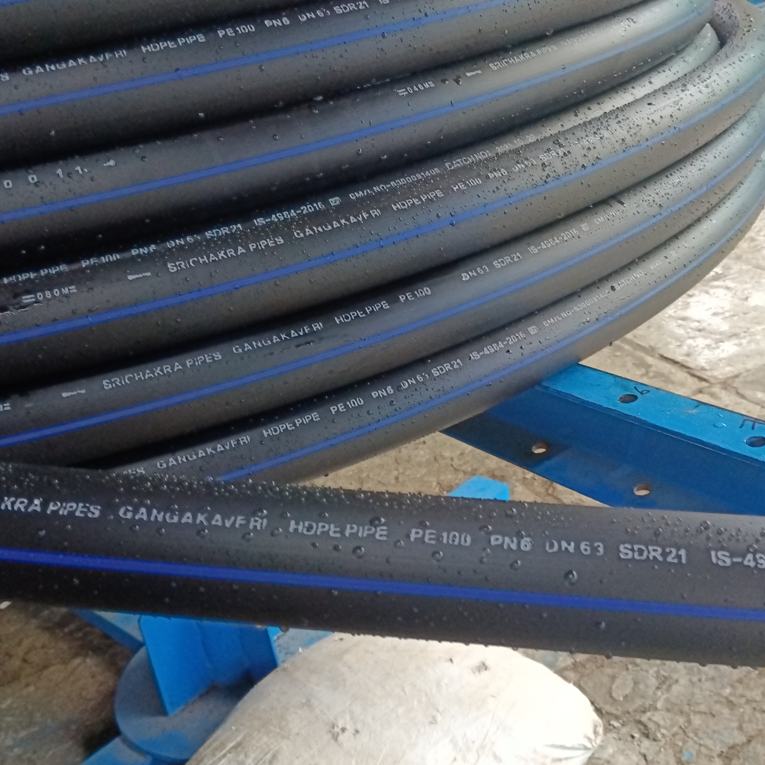 63mm Dia, PE100 GRADE, 6 kg/cm2 pressure, HDPE PIPES for water lines and Ducting applications, manufactured as per ISO & IS Standards. Please contact us for more information.